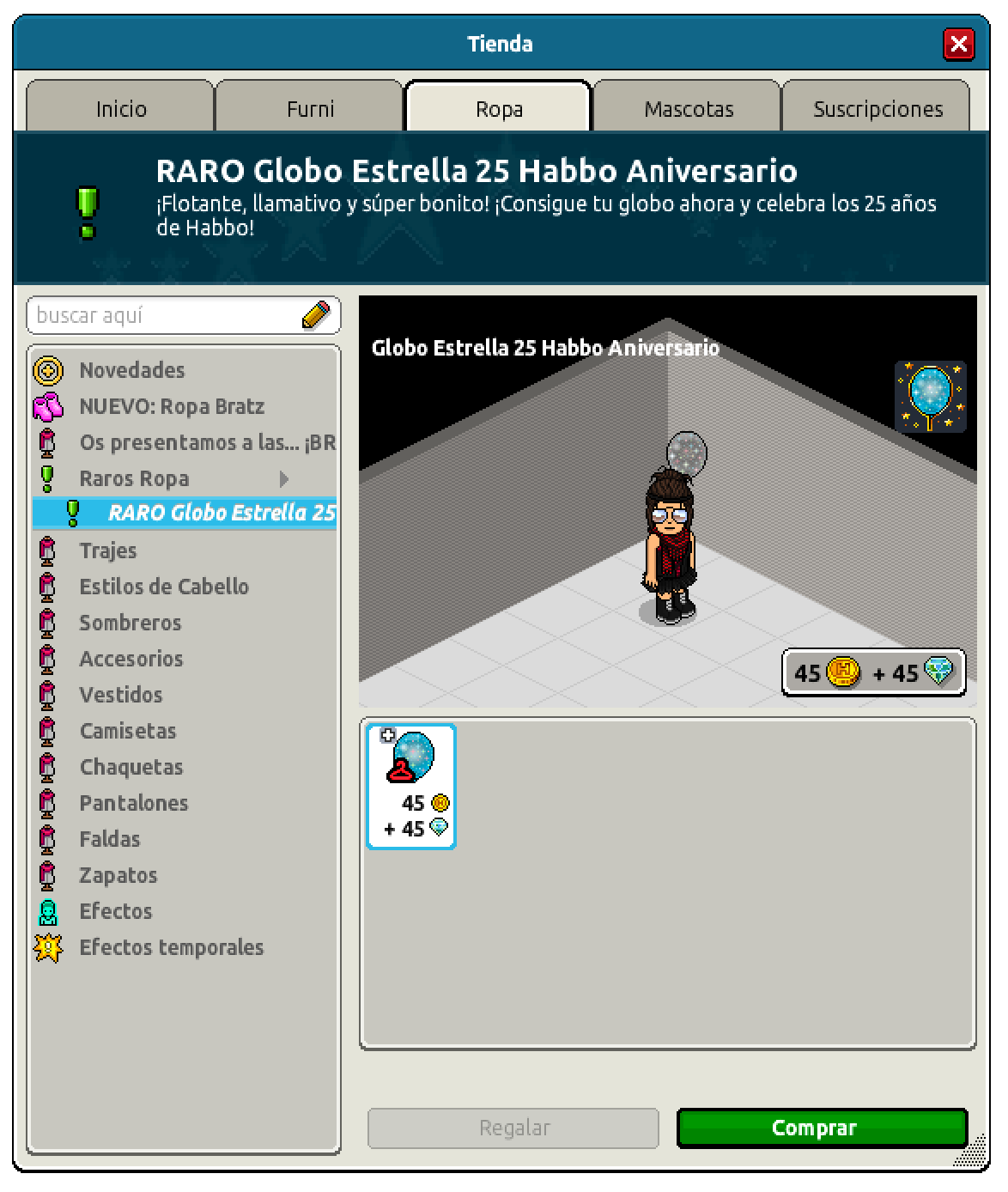 ¡Ha llegado un nuevo raro a catálogo! Se trata del Globo Estrella 25 Habbo Aniversario, un exclusivo accesorio que no querrás dejar pasar. Destaca por su diseño único y detalles que lo hacen imprescindible para cualquier colección o look.