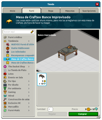 ¿Dónde la encuentras? Catálogo de Habbo > Furni > Tendencia > Mesa de Crafteo Banco Improvisado.
