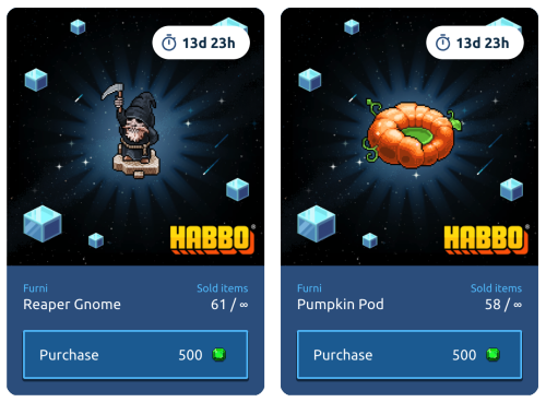 ¡Muy buenas, Habsiter@s! Se han añadido los primeros dos coleccionables pertenecientes al set Habboween 2025 y estarán disponibles hasta el 22/10.