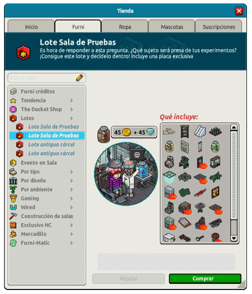 Disponible en el catálogo de Habbo → Pestaña Furni > Sección Lotes > Lote Sala de Pruebas.