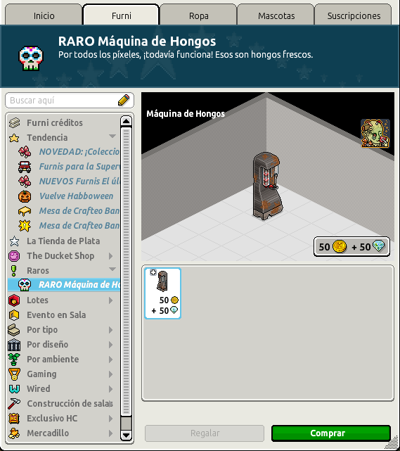 Disponible en el catálogo de Habbo → Pestaña Furni > Sección Raros > RARO Máquina de Hongos.