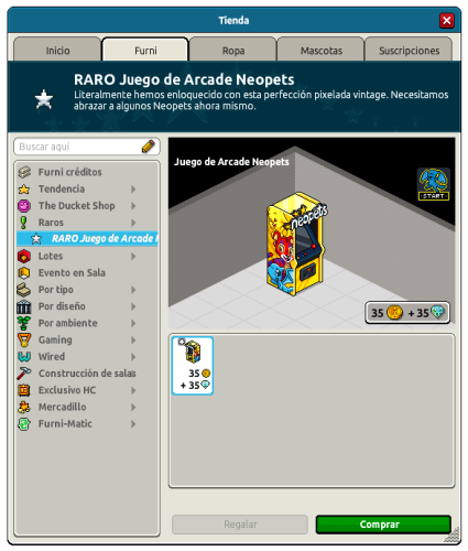 Disponible en el catálogo de Habbo → Pestaña Furni > Sección Raros > RARO Juego de Arcade Neopets.