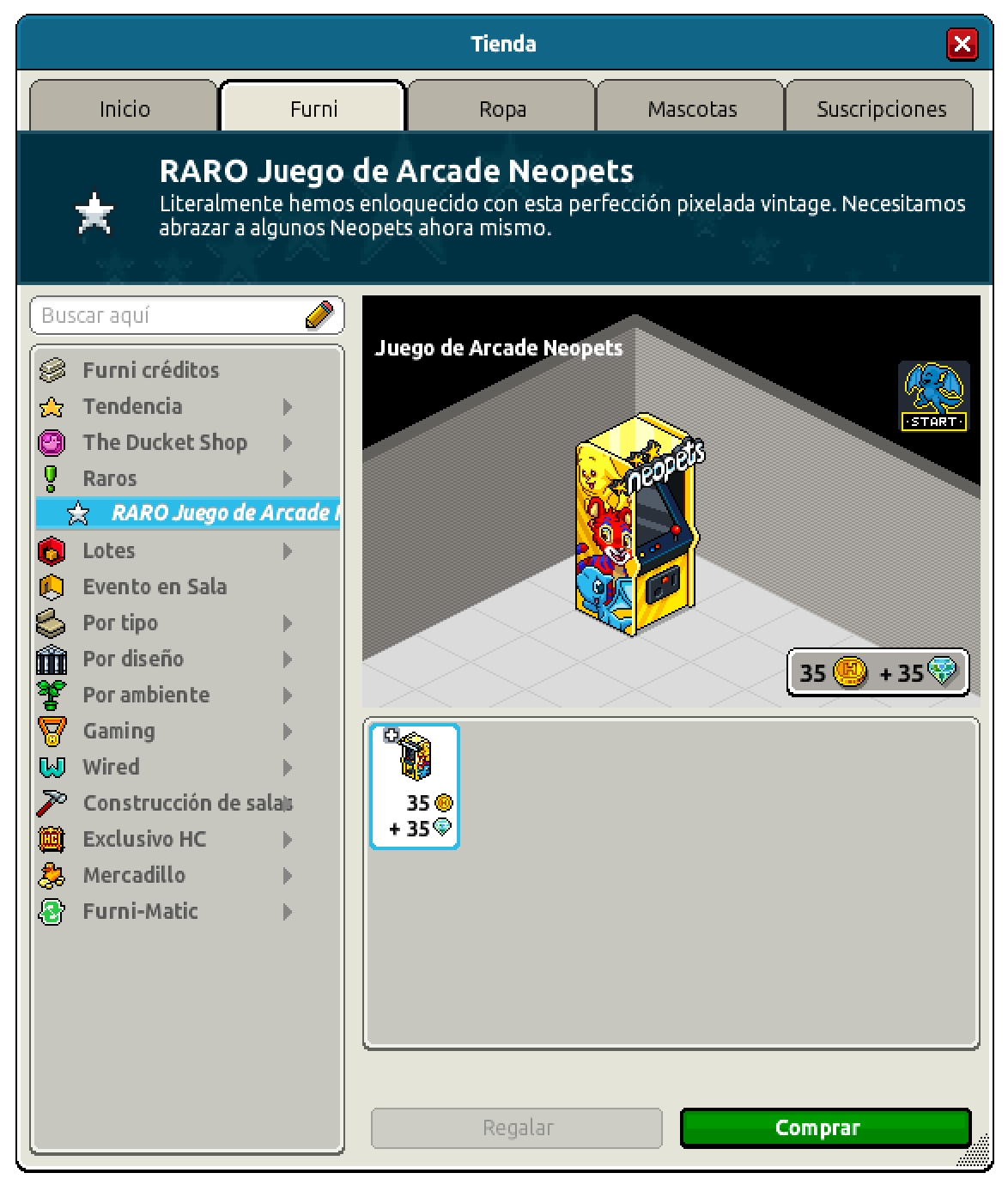 ¡Ha llegado un nuevo raro a catálogo! Se trata del raro Juego de Arcade Neopets, un exclusivo furni que no querrás dejar pasar. Destaca por su diseño único y detalles que lo hacen imprescindible para cualquier colección.