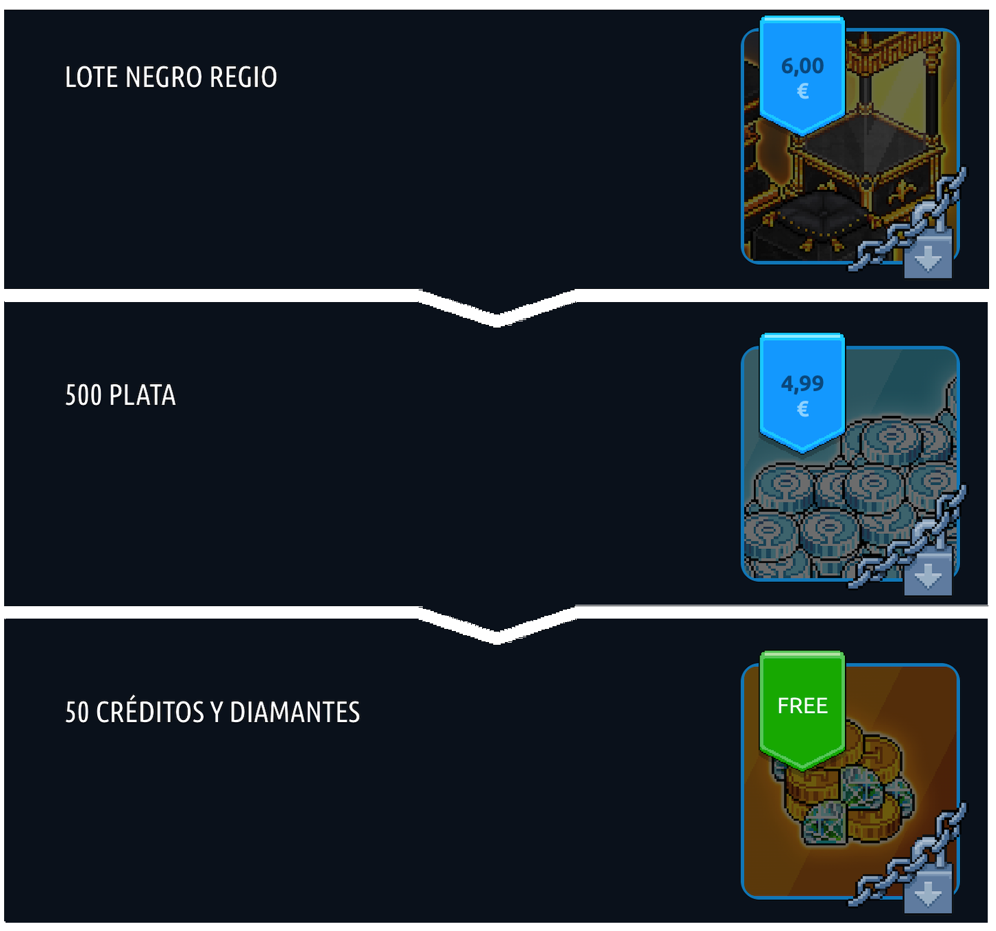 Si, en cambio, optas por adquirir el Sofá Trono a través de la Oferta del Día, activarás una cadena de promociones adicionales. Primero podrás acceder a un lote de furnis Negro Regio, luego a un paquete de monedas de plata y, finalmente, si completas las tres compras, desbloquearás 50 créditos y 50 diamantes totalmente gratis.