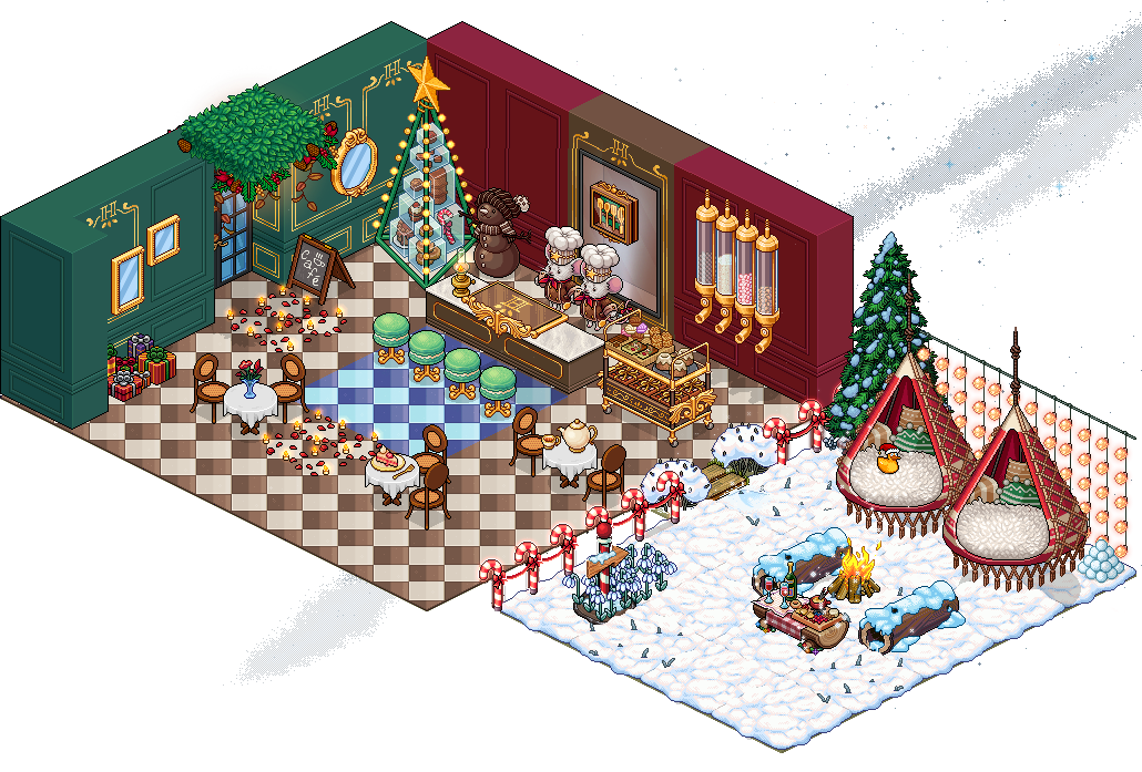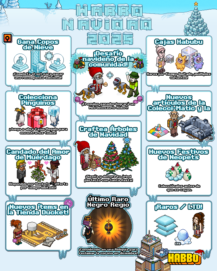 La temporada más acogedora del año llega al Hotel, trayendo consigo un ambiente festivo repleto de desafíos, coleccionables y muchas sorpresas. Las luces se encienden, la nieve empieza a caer y dos personajes muy conocidos se preparan para protagonizar uno de los enfrentamientos más navideños de la historia reciente de Habbo: Santa Rasta y DJ Bling.