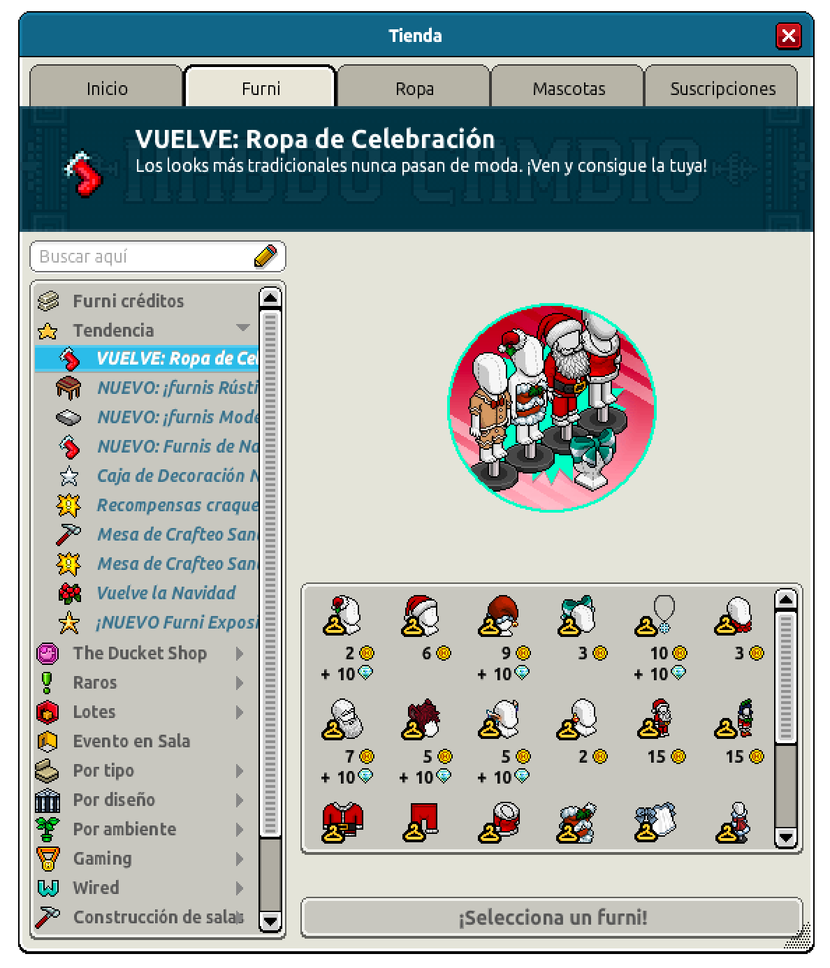 Disponible en el catálogo de Habbo → Pestaña Furni > Sección Tendencia > VUELVE: Ropa de Celebración.