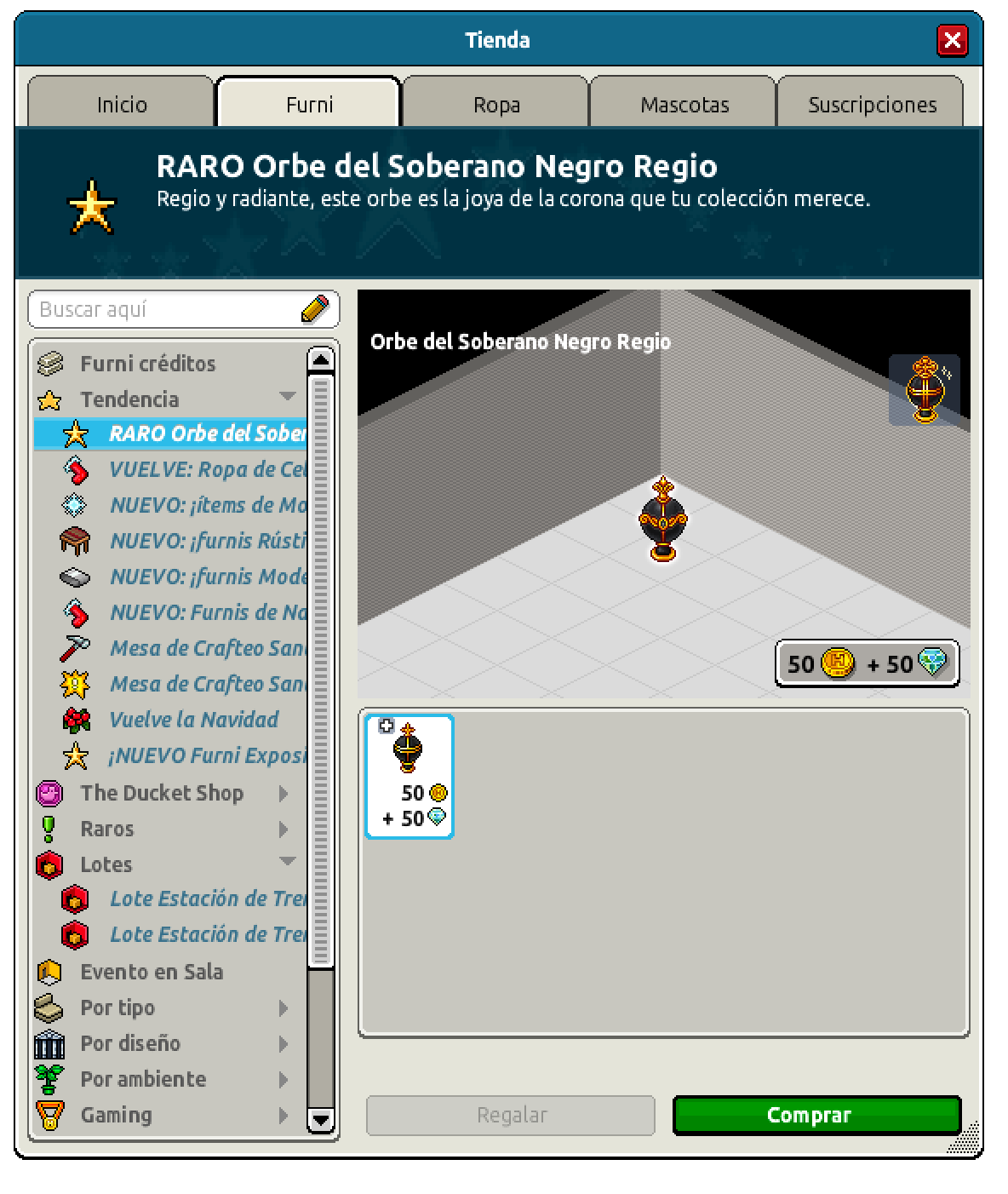Disponible en el catálogo de Habbo → Pestaña Furni > Sección Tendencia > RARO Orbe del Soberano Negro Regio.
