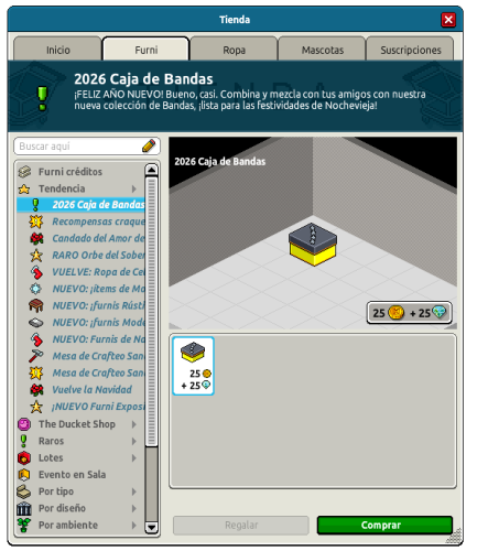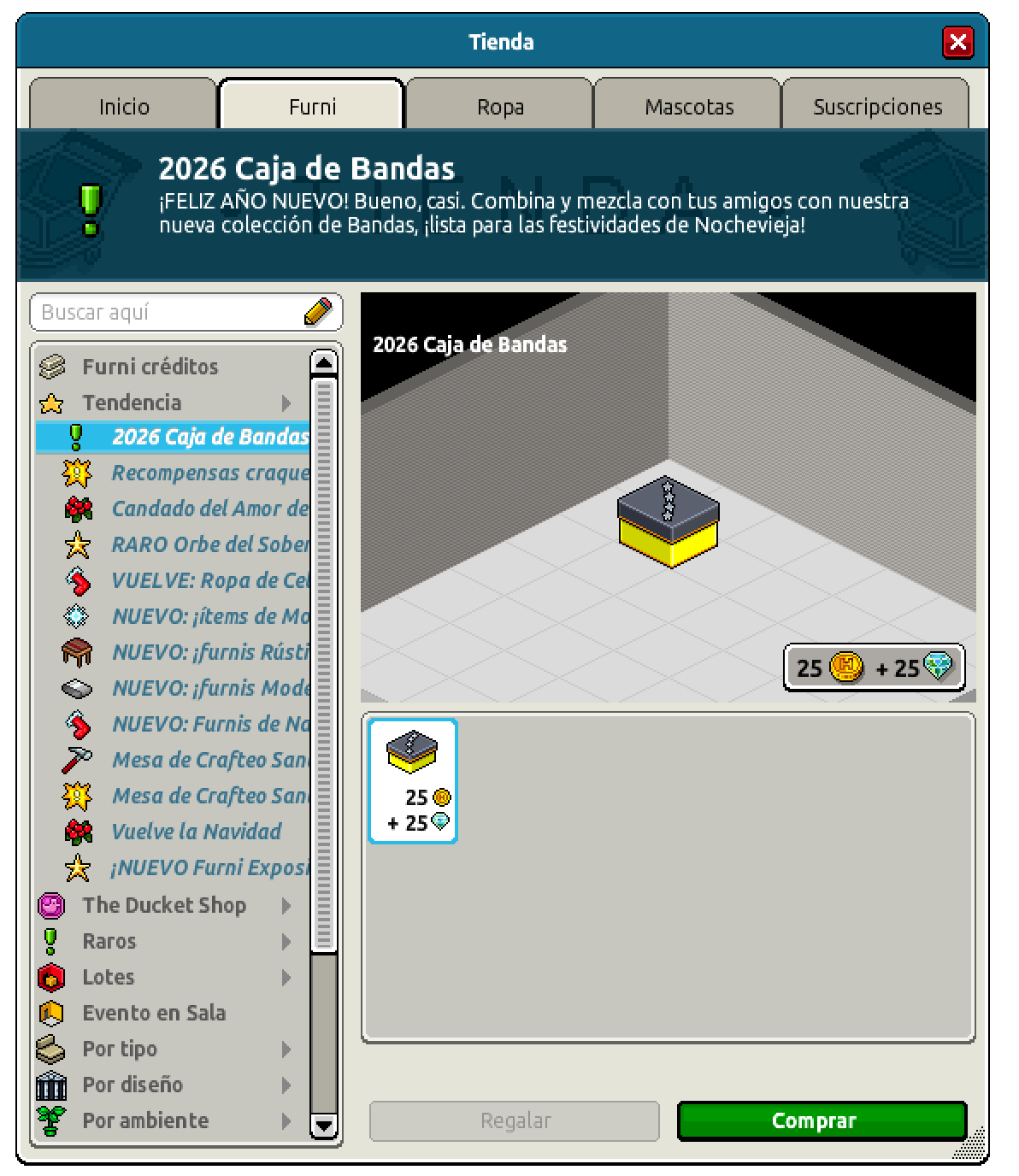 Puedes encontrarla en el catálogo dentro de la pestaña Furni, sección Tendencia, y luego 2026 Caja de Bandas su precio es de 25 créditos y 25 diamantes.