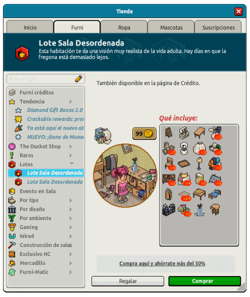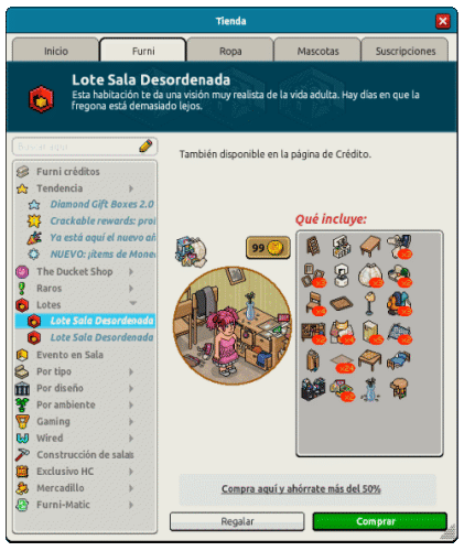 Disponible en el catálogo de Habbo → Pestaña Furni > Sección Lotes > Lote Sala Desordenada.