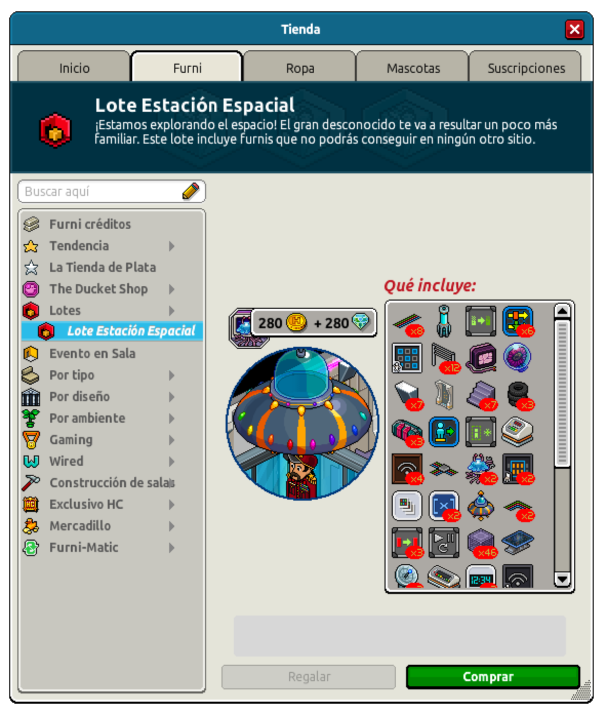 Disponible en el catálogo de Habbo → Pestaña Furni > Sección Lotes > Lote Estación Espacial.