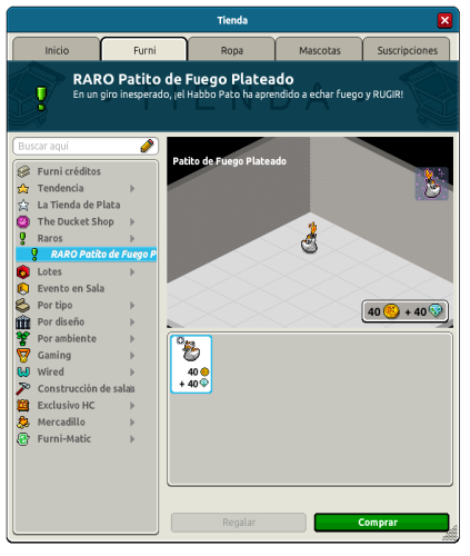 Disponible en el catálogo de HabboPestaña Furni > Sección Raros > ¡RARO Patito de Fuego Plateado!