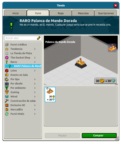 Disponible en el catálogo de Habbo → Pestaña Furni > Sección Raros > ¡RARO Palanca de Mando Dorada!