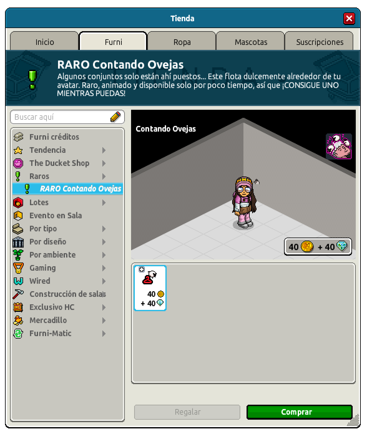 Disponible en el catálogo de Habbo → Pestaña Furni > Sección Raros > ¡RARO Contando Ovejas!