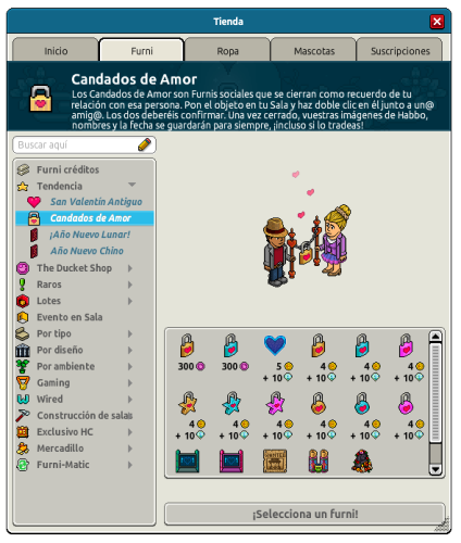Disponibles en el catálogo de Habbo → Pestaña Furni > Sección Tendencia > Candados de Amor.