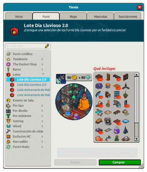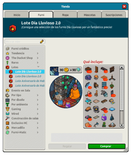 Disponible en el catálogo de Habbo → Pestaña Furni > Sección Lotes > Lote Día Lluvioso 2.0.