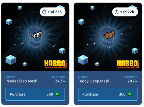 ¡Muy buenas, Habsiter@s! Se han añadido los siguientes coleccionables, los antifaces para Dormir Panda y Osito, pertenecientes al set de la campaña actual, set de Fiesta de Pijamas y estarán disponibles hasta el 20/02.