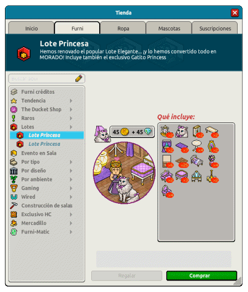 Disponible en el catálogo de Habbo → Pestaña Furni > Sección Lotes > Lote Princesa.