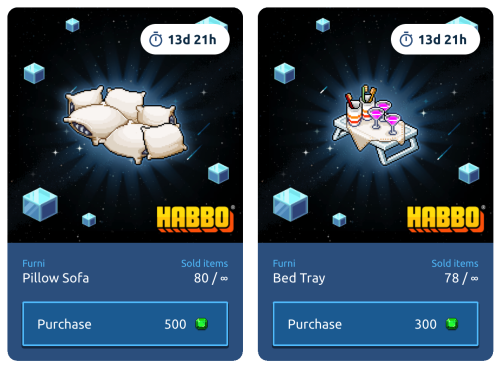 ¡Muy buenas, Habsiter@s! Se han añadido los últimos coleccionables, Sofá de Almohadas y Bandeja para la Cama, pertenecientes al set de la campaña actual, set de Fiesta de Pijamas y estarán disponibles hasta el 11/03.