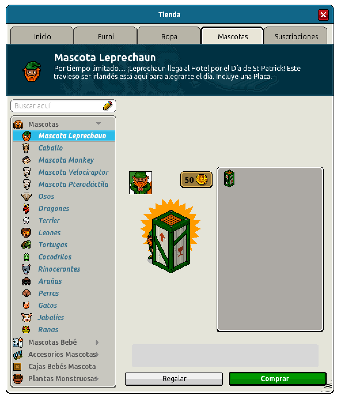 Podrás encontrarlo en el catálogo de Habbo -> Mascotas -> Mascota Leprechaun