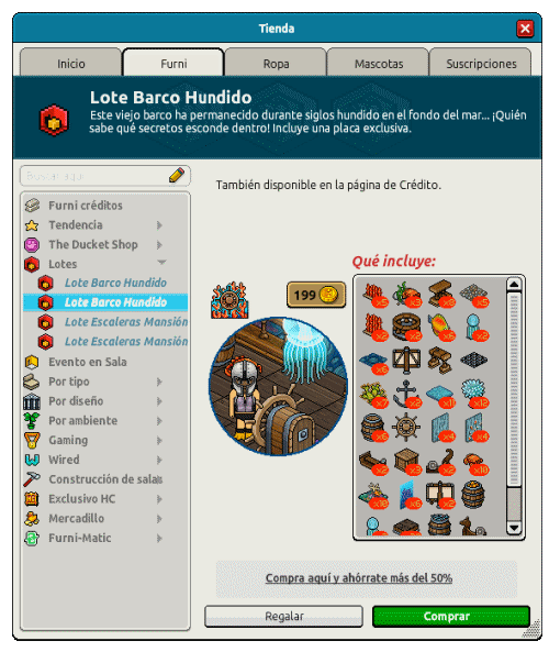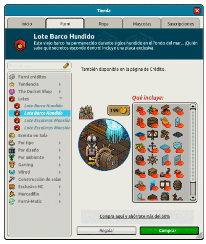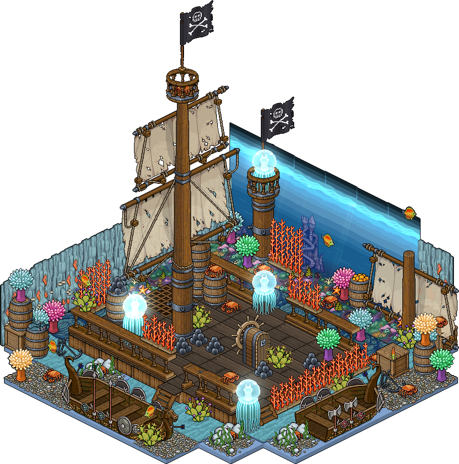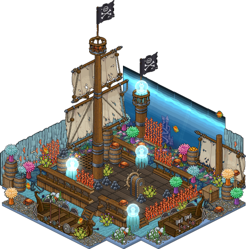 Disponible en el catálogo de Habbo → Pestaña Furni > Sección Lotes > Lote Barco Hundido.