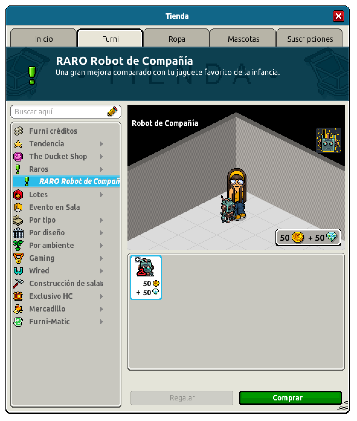 Disponible en el catálogo de Habbo → Pestaña Furni > Sección Raros > RARO Robot de Compañía