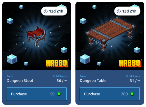 ¡Muy buenas, Habsiter@s! Se han añadido los siguientes coleccionables: Taburete y Mesa Mazmorra pertenecientes al set de la campaña actual y estarán disponibles hasta el 22/04.