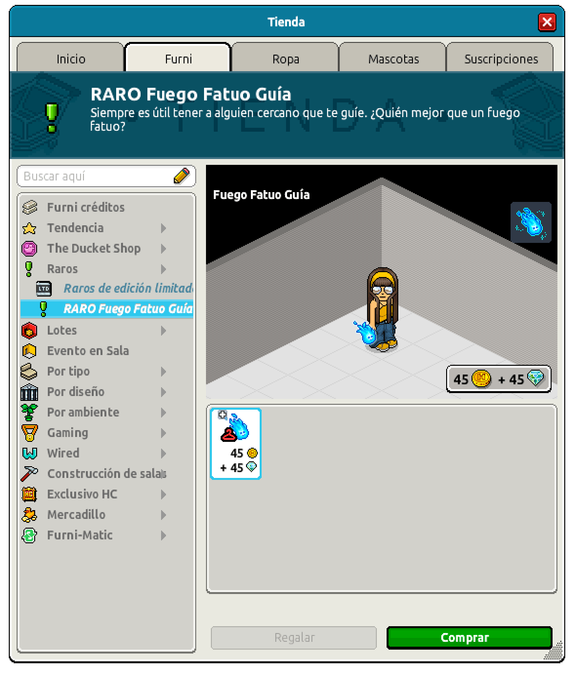 Disponible en el catálogo de Habbo → Pestaña Furni > Sección Raros > RARO Fuego Fatuo Guía