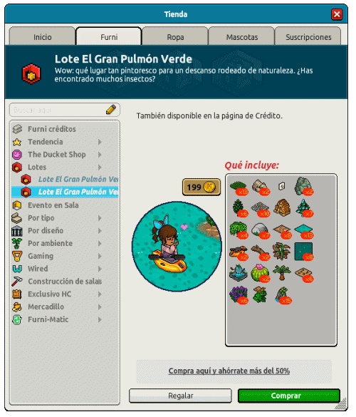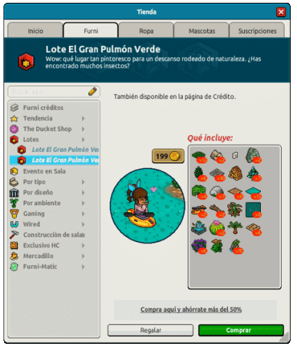 Disponible en el catálogo de Habbo → Pestaña Furni > Sección Lotes > Lote El Gran Pulmón Verde.